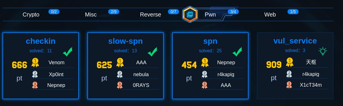 4 道题做出了 3 道,还抢到了一个二血。vuln_service没做出来,这是一道 Windows Pwn 题目,好像到比赛结束前最后几个小时才有人解出。