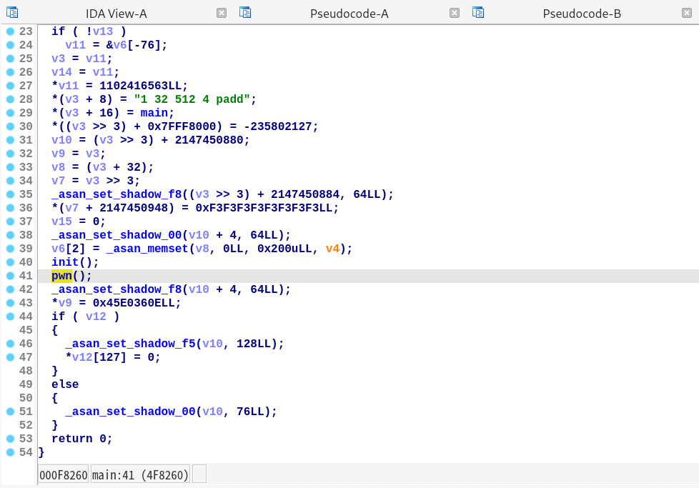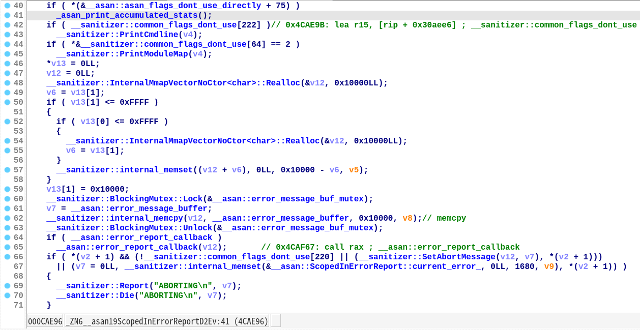 从 IDA 中可以看出,许多 ASAN 相关的函数和全局变量被直接编译进了程序中。