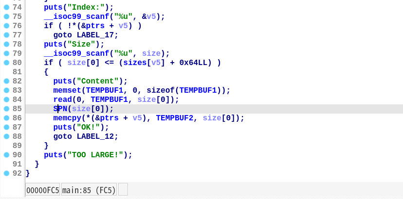 主要思路是不断返回main函数实现无限次任意地址写,修改.bss段上的变量,最后调用程序内部的execv函数 get shell。