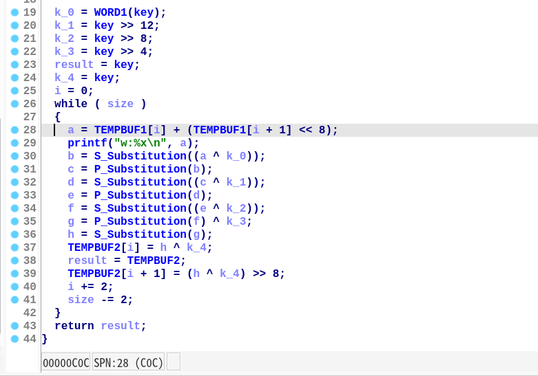 可以发现这个 SPN 算法以每 2 字节明文为一个分组,采取 ECB 模式进行加密。